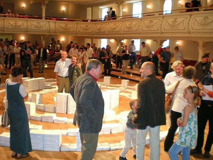 Wie das Bild zeigt, hatte man die ganzen Unterschriftenformulare zu einer Spirale mitten im Kaisersaal, nach zugehörigen Meldeämtern aufgebaut. Ich finde, das war der beste Platz, den man dafür ausgesucht hat. Wie von Uwe Beck, einer der Organisatoren zu erfahren war, hat die Spirale eine Gesamtlänge von 67 Meter. Würde man die Formulare in einer Reihe auslegen, ergibt das eine Strecke von 72 Kilometern. Beck bedankte sich in einer sehr erfrischenden Rede bei den vielen freiwilligen Helfern. Sein größter Dank galt den rund 250.000 Bürgerinnen und Bürgern, die ihre Unterschrift abgegeben haben und somit Herrn Althaus und seine Regierung in Zugzwang bringen.