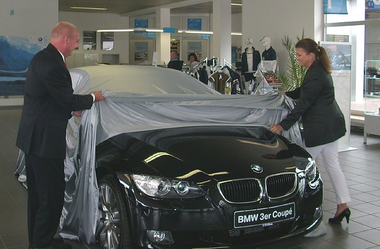 Steffi Fritze vom Autohaus Fritze und Andre Bochow, Leiter Vertrieb Aftersales der BMW Group Vertriebsregion Deutschland Ost, lüften vor den Gästen das Geheimnis, um welches Fahrzeug es sich handelt.