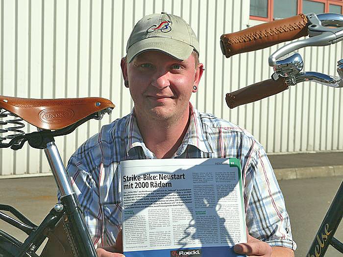 Erstens: Das Medieninteresse. Die Messe war noch nicht eine halbe Stunde eröffnet, da wurde unser Stand bereits von Journalisten belagert und wir mußten Rede und Antwort stehen. Auf dem nnz-Foto sieht man eine halbe Seite in einer Fachzeitschrift, die FAZ wird noch berichten, die Kollegen der Süddeutschen Zeitung hatten bereits am Samstag den Nordhäusern einen großen Absatz ihres Messeberichtes gewidmet. Eine der günstigsten Rad-Neuheiten der Saison ist das ‚Volksrad’ von ‚Strike-Bike’ aus dem thüringischen Nordhausen, ist da in der Münchener Ausgabe zu lesen. Dann wird kurz die Geschichte des jungen Unternehmens erzählt, bevor zum Ende noch einmal kräftig die Werbetrommel mit Preisangabe gerührt wird.
