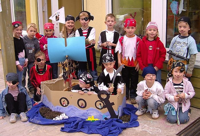 Alle Mann an Bord hieß es am letzten Mittwoch in der Kinderwelt am Frauenberg. Gut erholt waren alle Piratenkinder mit ihren Eltern aus dem Urlaub zurückgekehrt und hatten trotz schlechten Wetters super Feierlaune mitgebracht. Beim zünftigen Piratenfest wurde gesungen, getanzt und gelacht. Natürlich wurde auch die Schatzkiste geplündert und der Hunger mit Bratwürstchen besiegt. Am Allerbesten schmeckte aber der Schiffszwieback, den sich alle kleinen Seeräuber an langen Stöcken über dem Lagerfeuer selbst zubereiten konnten.