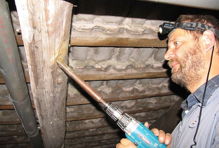 Unsere Analysen stützen sich auf die Dendrochronologie, der Wachstumsphasen des Holzes, erklärt er. 1506 ist der Bau der Flohburg in den Archiven vermerkt. An Hand der entnommenen Bohrkerne aus dem Gebälk des Haupthauses können wir dieses Jahr bestätigen oder eventuell revidieren. Am Bohrkern erkenne manan den Jahresringbreiten die ganz spezielle Wuchsspezifik und könne so eine repräsentative Bauzeit bestimmen. Auch könne man am Balken an den Werkzeugspuren erkennen, mit welchem Werkzeug gearbeitet wurde, was wiederum Aufschluss auf die Bauzeit gebe.