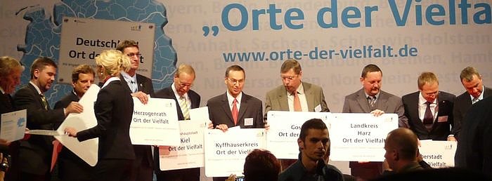 Mit der bundesweiten Initiative Orte der Vielfalt unterstützen und fördern das Bundesministerium für Familie, Senioren, Frauen und Jugend, das Bundesministerium des Innern und die Beauftragte der Bundesregierung für Migration, Flüchtlinge und Integration das Engagement der demokratischen Kräfte in Städten, Gemeinden und Kreisen zur Stärkung von Vielfalt, Toleranz und Demokratie. Als Zeichen der Anerkennung werden Kommunen, die sich besonders für Vielfalt, Toleranz und Demokratie engagieren, mit einem Schild ausgezeichnet, das an zentraler Stelle aufgestellt wird und sie als beispielhaften Ort der Vielfalt ausweist.