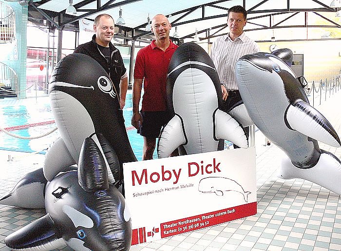 Die Theater Nordhausen/Loh-Orchester Sondershausen GmbH will mit den Walen auf die nächste Premiere im Theater unterm Dach aufmerksam machen. Das Junge Theater hat die Produktion des Schauspiels Moby Dick auf dem Spielplan, das von der Leiterin Bianca Sue Henne inszeniert wird. In den verschiedenen Rollen des Romanklassikers von Herman Melville begeben sich Uta Haase und Sigrid Herforth auf Walfang. Die spannende Bühnenfassung von Moby Dick ist für Kinder ab 8 Jahren und Erwachsene gleichermaßen packend und unterhaltsam.