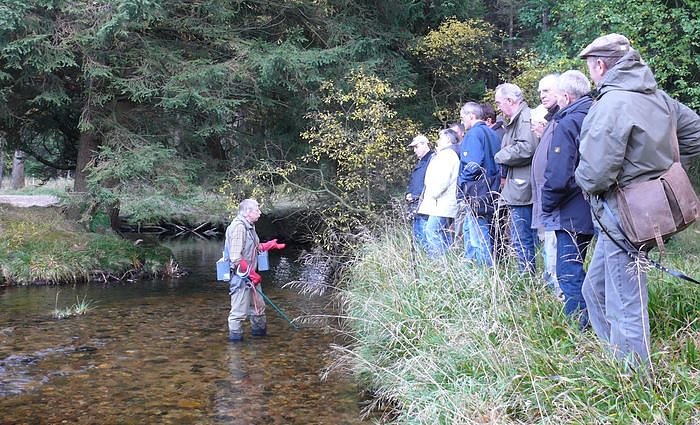 Eine anschließende Exkursion führte die Teilnehmer an die Kalte Bode und deren Seitenbäche oberhalb von Schierke. Hier demonstrierte Nationalpark-Mitarbeiter Otfried Wüstemann (Foto) die Arbeit mit einem Gerät für die Elektrobefischung. Damit lässt sich der Fischbesatz solcher Gewässer in schonender Weise ermitteln. Als erfreuliches Fazit konnte gezogen werden, dass sich die Bachforelle in den letzten Jahren alte Lebensräume in den Gebirgsbächen wieder erobert hat.