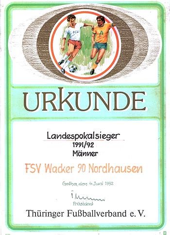 1992 besiegten wir im Thüringer Pokalendspiel Wismut im neutralen Gotha verdient 2:1. In der Aufstellung Fienhold, Weiß, Gogsch, Gerlach (46. Große), J. Ludwig, Kiel, Schneider, M. Weißhaupt, F. Ludwig, Görke, Heider (88. Etzrodt) wurde der Pott geholt. Weißhaupt verabschiedete sich mit seinen zwei Toren für viele Jahre aus Nordhausen. Der 1. FC Köln in der DFB-Hauptrunde war der Lohn des Triumphes.