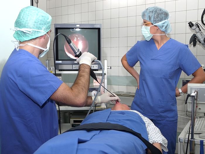 Das sind die Schlafendoskopie und die Speicheldrüsenendoskopie. Bei letzterer Therapie ist es möglich, mittels eines millimeterdünnen Endoskops, durch den Rachenraum des Patienten zum Beispiel Steine aus der Speicheldrüse zu entfernen. Bislang waren dazu Operationen notwendig, jetzt können die Schnitte am Kopf vermieden werden.
