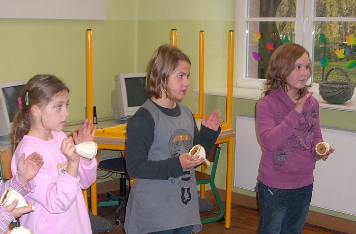 Heute war das Musikmobil bei der Premierenfahrt noch nicht weit gerollt. Es stand am Nachmittag im Hof der Käthe-Kollwitz-Schule in Sondershausen. Hortkinder der ersten bis vierten Klasse werden spielend von Musikstudenten an die Musik herangeführt. Dabei werden auch nicht so bekannte Musikinstrumente eingesetzt, um das Rhythmusgefühl der Kinder zu schulen. Auf den Bildern zu sehen ist die Arbeit mit dem Caxixi (sprich: Kaschischi). Caxixi sind geflochtene Körbchenrasseln mit Griff, die mit Kernen gefüllt werden. Ebenfalls mit dabei ein Kamerateam des MDR, das gleich eine komplette Reportage dreht.
