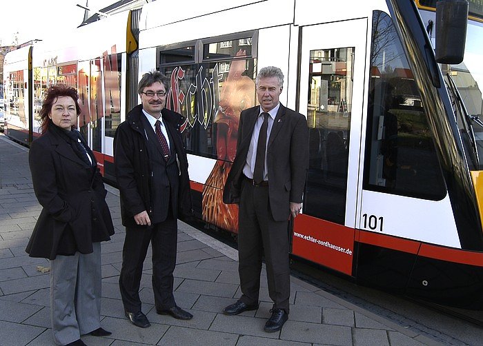 Autor: nnzGestern begrüßten die Geschäftsführer der Verkehrsbetriebe Nordhausen und der Nordbrand Nordhausen GmbH, Gabriele Schuchardt, Mathias Hartung und Hans-Joachim Junker und (v. l. n. r.) den neu gestalteten Triebwagen Nr. 101 an der Haltestelle Nordbrand in der Bahnhofstraße.
