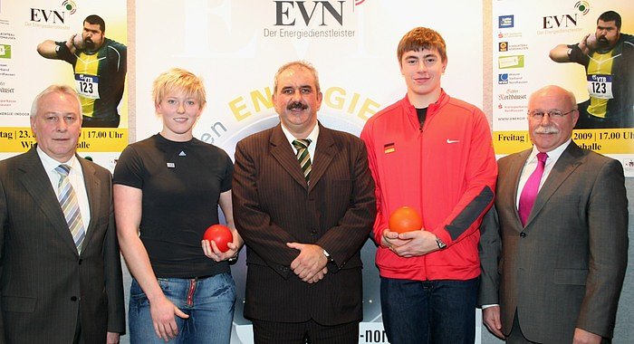 Beide Ausnahmeathleten treffen dabei auf die gesamte deutsche Elite. Zwei davon, die Gewinnerin des Indoors der Jahre 2005 und 2007, Petra Lammert, und der diesjährige Nachwuchsgewinner und Jugendweltmeister David Storl wurden während einer heutigen Pressekonferenz in den Räumen der Energieversorgung Nordhausen vorgestellt. Die EVN hat sich auch in diesem Jahr wieder an die Spitze der Sponsoren gestellt.