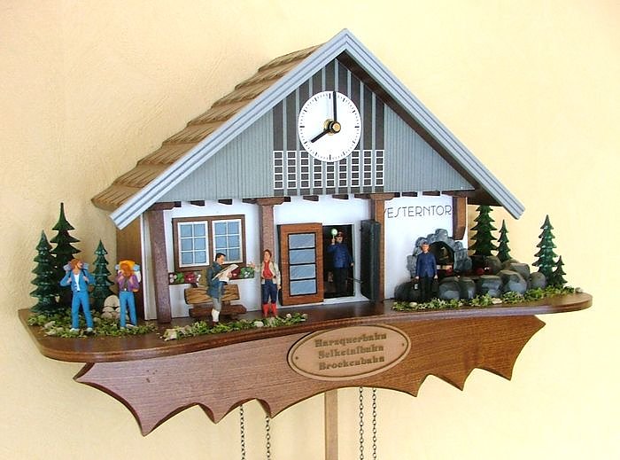 Bei der Harzer Schmalspurbahnen GmbH (HSB) ist ab sofort eine Bahnhofs-Wanduhr mit pfeifendem Eisenbahner, Nostalgie-Dampfzug und Miniaturfahrgästen erhältlich. Pünktlich zur vollen Stunde beginnt jeweils das besondere Schauspiel: Ein blau gekleideter Miniatur-Eisenbahner tritt aus der Tür des nachgebildeten Bahnhofes Wernigerode Westerntor heraus und gibt mit der Anzahl seiner Abfahrts-Pfiffe die aktuelle Stundenzahl an.