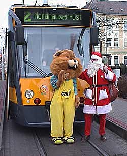 Kurz nach 10 Uhr stieg an der Haltestelle gegenüber dem Depot dann auch noch der Nikolaus in den COMBINO ein. Der verteilte (nicht nur an Kinder) kleine Geschenke. Für die Stadtwerke und für die Nordhäuser hat sich die Entscheidung für die Siemens-Fahrzeuge bislang gelohnt. Der erste seiner Art hat seit dem diesjährigen Rolandsfest bereits rund 30.000 Kilometer absolviert und das ohne jegliche Beanstandungen. Der "COMBINO 102" wurde innerhalb weniger Tage in Betrieb genommen. Und die Vorteile für die Fahrgäste liegen doch quasi "auf dem Fuß": Bequemes Ein- und Aussteigen, angenehmes Sitzen - sprich viel Komfort. Die nächsten beiden Fahrzeuge sollen dann im Jahr 2002 nach Nordhausen kommen.