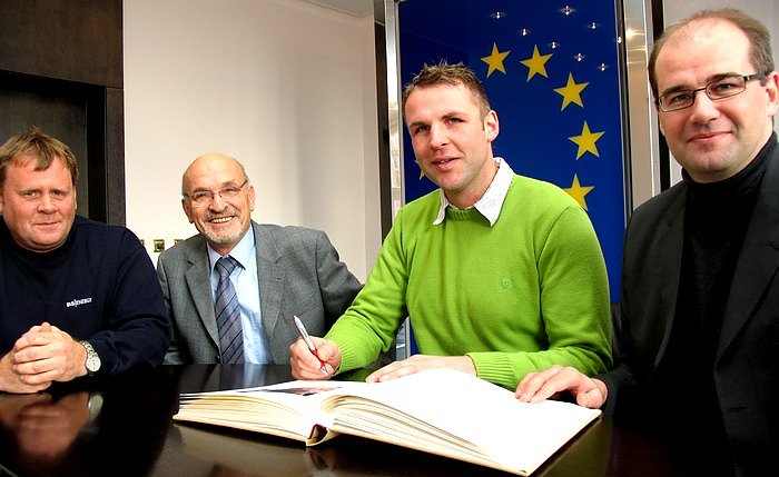 In das Ehrenbuch der Stadt Nordhausen eingetragen hat sich heute der Nordhäuser Schwergewichtsboxer Michael Werner im Rathaus. Anlass ist das Ende der sportlichen Laufbahn von Werner, die er mit einem k.-o.-Sieg gegen den amtierenden Thüringen-Meister Martin Pett bei der jüngsten Nordhäuser Boxnacht gekrönt hatte. Michael Werner ist 12-facher Thüringer Landesmeister und zweifacher dritter Deutscher Meister. Er hatte 151 Kämpfe absolviert. Der 31-jährige hatte mit seinem 9. Lebensjahr mit dem Training begonnen.