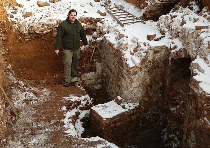 Autor: nnzMarkus Wehmer an den freigelegten Grundmauern. Vermutlich gehören sie zum Pferdemarkt 4