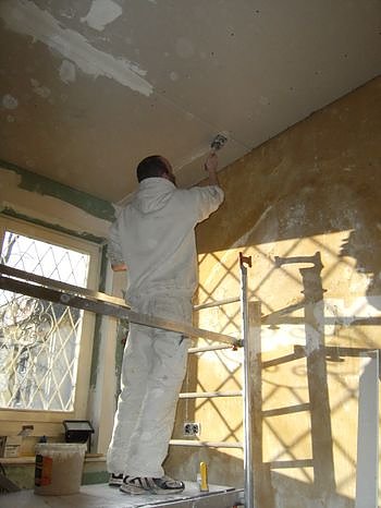 Durch die Havarie – es war eine im Zwischenboden verlaufende Leitung geplatzt – sind große Mengen Wasser tief ins Mauerwerk eingedrungen. Seit Wochen laufen nun spezielle Trocknungsgeräte rund um die Uhr auf Hochtouren, um die Feuchtigkeit aus den Wänden zu ziehen. Wenn die Handwerker schon einmal ran müssen, dann doch gleich nachhaltig, sagten sich die Verantwortlichen im MEGEHA: Im Zuge der nun begonnenen Renovierungsarbeiten, die teilweise von Mitarbeitern der LIFT ausgeführt werden, wird daher auch die Wärmedämmung eines Teilbereiches des Mehrgenerationenhauses verbessert und den heute gängigen Standards angepasst. Dazu wurde im Computer- und Mehrzweckraum, der über eine Deckenhöhe von fast vier Metern verfügt, eine Wärme isolierende Zwischendecke eingezogen. Auch die Wände bekommen eine Isolationsschicht. Diese Maßnahmen tragen nicht nur zu einer künftigen Einsparung von Heizkosten im MEGEHA bei, sondern dienen auch dem Klimaschutz.