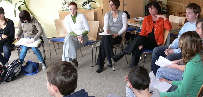 Das Foto zeigt Schüler in Ellrich mit der Leiterin des Jungen Theaters und Dramaturgin Juliane Hirschmann bei der Vorbereitung der Einführung