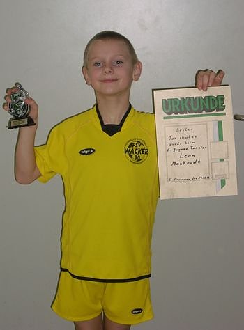Sechs Siege bedeuteten in der Endabrechnung den ersten Platz für die FI-Junioren des FSV Wacker 90 Nordhausen vor den beiden Juniorenteams Sondershausen FII und Worbis. Freuen konnten sich die Nordhäuser am Ende nicht nur über den Turniersieg, sondern auch darüber, dass sie mit Leon Mackrodt (Foto) den Torschützenkönig des Turniers stellten. Von insgesamt 18 Toren steuerte der neunjährige Wacker-Akteur zehn Treffer bei. Weiter erfolgreich waren Arved Ruff (4 Tore), Leonard Müller (3) und Paul Bräuer (1).Somit geht eine erfolgreiche Hallenturnierzeit zu Ende. Denn nicht nur in Sondershausen waren die Kicker erfolgreich. Auch in Ellrich und Sangerhausen konnten die Wacker-Jungs von Lutz Bräuer und Franziska Bernsdorf mit einem 2. und 3. Platz glänzen.