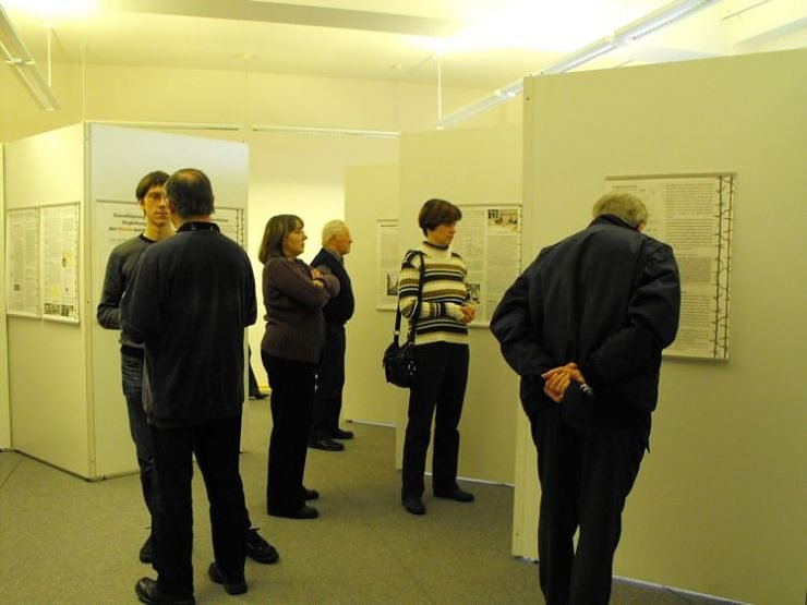 Herr Gündel von der Stadt- und Gästeführergilde e.V. führt durch die Wanderausstellung Im Tod lebendig in der Nordhäuser Petersberg Schule. Die Ausstellung zeigt Lebensbilder von Häftlingen des ehemaligen KZ Mauthausen. Sie bietet vor allem vielen jungen Besuchern eine besondere Anregung für eine sinnvolle und aktive Auseinandersetzung mit dem Thema Widerstand und Verfolgung im Faschismus., so Dr. Ludwig Einicke vom Deutschen Mauthausen Komitee Ost und Organisator der Ausstellung.