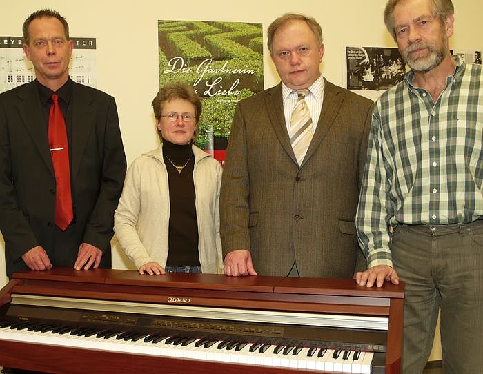 Die Schachtbau Nordhausen GmbH hatte sich am Erwerb eine Pianos für die Regelschule in Nordhausen Ost beteiligt. (Von links: Ronald Hühne, Christine Stilzebach vom Bildungswerk der Thüringer Wirtschaft, Heino Kupfer, Reiner Voigt)