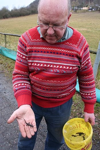 In Hainrode sind die Bedingungen sehr gut. Wir haben eine Teichkette und ringsherum einen relativ naturnahen Waldbereich, in dem sich die Tiere im Winter verstecken können. Wir haben hier erfreulicherweise eine stabile Population, die sich in den vergangenen Jahren positiv entwickelt hat. Wir haben hier mit 7.000, 8.000 Tieren angefangen und jetzt haben wir im Schnitt 15.000 in einer Wandersaison. Im vergangenen Jahr wurde diese Zahl sogar noch übertroffen - im Gegensatz zu den anderen Schutzzaungebieten, in denen die Helfer weniger Tiere als in Vorjahren gezählt haben. Letztes Jahr hatte ich hier fast 37.000 Tiere. An einem Morgen habe ich rund 3.000 Tiere gezählt, erinnert sich Volkmar Sauerbier. In seinem Eimer hat er schon wieder zehn Berg- und Teichmolche gesammelt, der er nun zu den Teichen bringt.