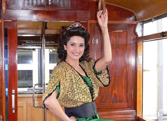 Für ihr Nordhäuser Publikum hat sich Filipina Henoch in Ermangelung einer U-Bahn in einer Straßenbahn fotografieren lassen. Die Berlinerin war erstaunt und hoch erfreut, dass die Nordhäuser Stadtwerke historische Bahnen im Fuhrpark haben und auch für spezielle Anlässe anbieten.