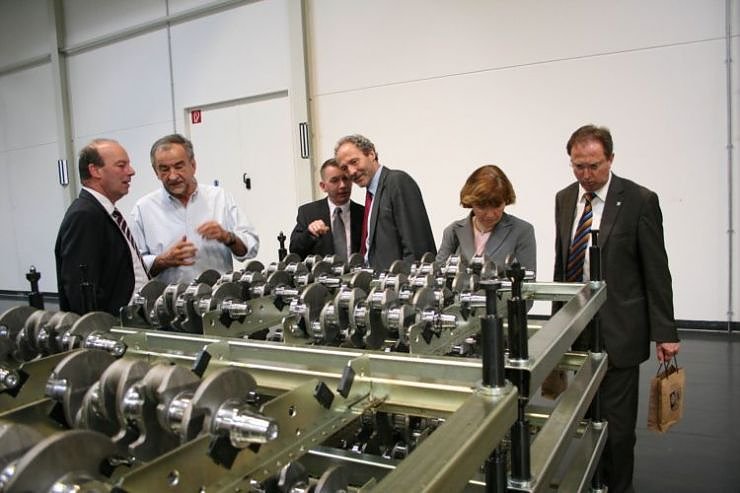 Hans-Joachim Weirather ist seit 2006 im Amt und zeigte sich bei seinem Antrittsbesuch beeindruckt von der Region. Gemeinsam mit Erwin Marschall, zuständig für Tourismus- und Wirtschaftsförderung der Kneipp-Region Unterallgäu, und Engelbert Degenhart, Leiter der Organisation im dortigen Landratsamt in Mindelheim, schaute sich der Landrat heute und gestern einige wirtschaftliche und touristische Höhepunkte an. So führten Inhaber Dieter Feuer und Geschäftsführer Oliver Wönnmann die Besucher aus Bayern in Begleitung von Landrat Joachim Claus, Büroleiter Manfred Thiel und Wirtschaftsförderin Dr. Sabine Mehne durch die Werkshallen von FEUER-Powertrain. Stilecht fuhren die Gäste in einem Oldtimer Ford von 1923 des Autohauses Prengel bei den Kurbelwellen-Produzenten vor.