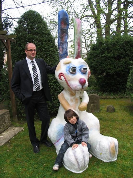 Auch Bürgermeister Matthias Jendricke freute sich über den lustigen Hasen, der nun jedes Jahr den Petersberg schmücken wird. Angedacht sei, jedes Jahr einen neuen Hasen anfertigen zu lassen, die dann im Stadtgebiet verteilt, auf das Osterfest einstimmen sollen, sagte er.