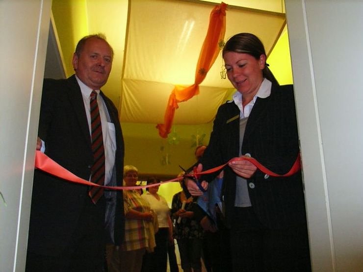 Bild 1: Victoria Rammelt, Gebietsleiterin der Nordthüringer Volksbank eG, schnitt zusammen mit Eberhard Kopyra das Band zur ersten Galerieeröffnung im MEGEHA durch.