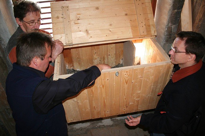 Gemeinsam mit Pfarrer Richard Hentrich stiegen Rolf Schiffler und sein Kollege Matthias Piontek in dieser Woche auf die Domtürme. Pfarrer Hentrich ist sich sicher, dass die Kästen im vergangenen Jahr schon bewohnt waren. Ein Turmfalke hat hier gebrütet. Ich habe auch die Jungen fliegen sehen, erinnert sich der Pfarrer. Das bestätigt auch ein Blick in den großen hellen Holzkasten, der eigentlich als Brutstätte für eine Schleiereule gedacht war.