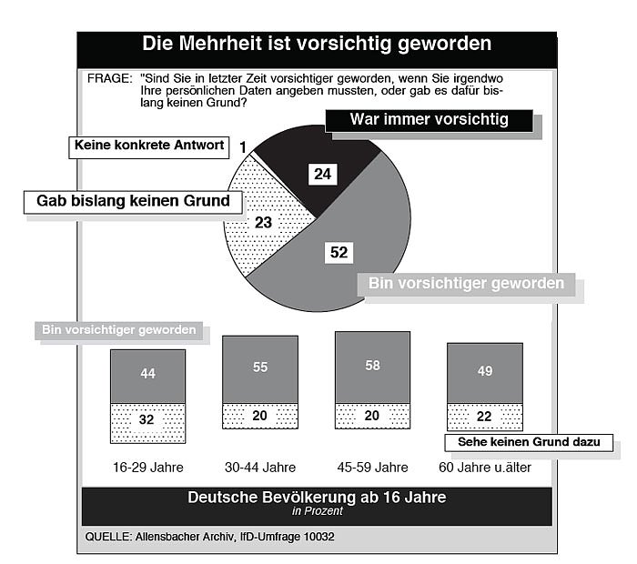 Mehr als jeder Zweite aus der Bevölkerung (52 Prozent) betont, dass er in letzter Zeit vorsichtiger geworden ist, wenn irgendwo persönliche Daten abverlangt werden. 24 Prozent waren auch schon vorher vorsichtig mit der Veröffentlichung und Weitergabe persönlicher Daten. 23 Prozent sehen allerdings bislang noch keinen triftigen Grund für einen besonders vorsichtigen Umgang mit persönlichen Daten. Zu dieser letzten Gruppe, die sich nicht allzu viele Gedanken über den Missbrauch von persönlichen Daten machen will, gehören vor allem jüngere Leute. Von den Unter-30-Jährigen sagt das fast jeder Dritte (32 Prozent).