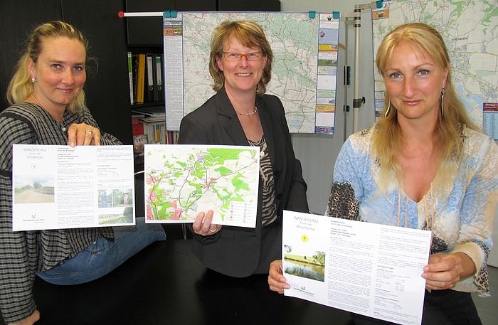 Autor: nnzDezernentin Inge Klaan (Mitte), Silke Fröhlich (rechts) und Mona A. Grabinsky (links) zeigen die neuen Informationsblätter, die Naturfreunde über attraktive Wandermöglichkeiten und Sehenswertes am Wegesrand informieren. Im Hintergrund der neue Stadtplan mit Wanderkarte