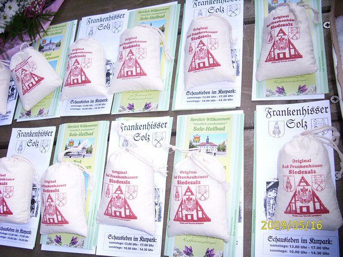 Das Prospekt soll Sie aber anregen, mal wieder nach Bad Frankenhausen zu fahren, denn dort hat sich nicht nur die Verpackung des Siedesalzes geändert, sondern auch im Ort hat sich einiges wieder getan. Mit "Rolf Münzner – Grafik und Zeichnung" im Panoramamuseum (vom 01.03.2009 bis 01.06.2009) und "Wenn jemand eine Reise tut" im Regionalmuseum (vom 17.05.2009 bis 20.09.2009) laufen zurzeit auch sehr interessante Sonderausstellungen in Bad Frankenhausen.