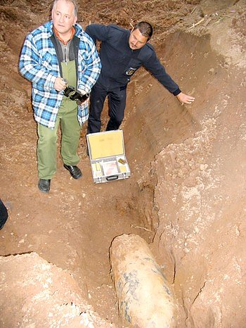 Zum Foto: Sprengmeister Andreas West (links) mit einem Teil der Fernentschärfungsvorrichtung. Sie wird auf den Zünder geklemmt und ferngesteuert mit Hilfe von kleinen Raketentreibsätzen in so schnelle Rotationen versetzt, dass in weniger als einer Sekunde der Zünder aus der Bombe gelöst wird