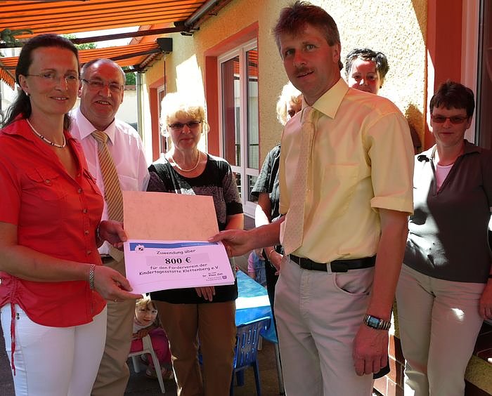 Die Vorsitzende des Fördervereins, Diana Ehrhardt (links), erhält aus den Händen von Bürgermeister Andreas Gerbothe den symbolischen Scheck. Im Hintergrund Landtagsabgeordneter Egon Primas (2. v.l.) und die Leiterin der Einrichtung, Sonja Kraft