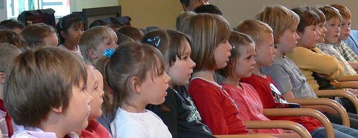 Rund 60 Schüler im Alter von 6 bis 7 Jahren lauschten dem Loh-Orchester, das sich momentan auf die Schlossfestspiele Sondershausen 2009 Im Weißen Rössl vorbereitet. Der musikalische Leiter, Pit Uhden, begrüßte die Kinder herzlich und stellte ihnen noch kurz einige Instrumente aus den hinteren Sitzreihen des Orchesters vor, die die Mädchen und Jungen während der Probe nicht sehen konnten.