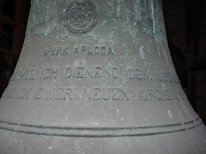 Beim Gang durch die völlig von außen mit Gerüsten zugestellte Kirche führte sein Weg auch zu den Glocken. Bei einem seiner letzten intensiven Inspektionen seiner Kirche war ihm an einer der Glocken etwas seltsames aufgefallen. An der aus der Glockengießerei Apolda stammenden Glocke stand nicht etwa Werk Apolda, sondern Werk Aploda. Ein Fehler beim Guss, der bisher völlig unbemerkt geblieben. Sogar in allen Gutachten zur Glocke ist dieser Fehler nicht verzeichnet worden, wie Pfarrer Albrecht bemerkte.