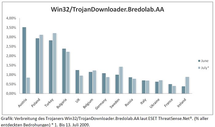 Laut den Statistiken der ESET Virenlabors treibt Bredolab in ganz Europa sein Unwesen. In Tschechien und der Slowakei ist er der meistverbreitete Schädling. In Österreich, Polen und der Türkei rangiert er unter den Top 5. In Deutschland, England, Schweden, Belgien und Russland wird Bredolab unter den Top 10-Schädlingen geführt. Auch in zahlreichen weiteren europäischen Ländern verbreitet sich Bredolab rasant.