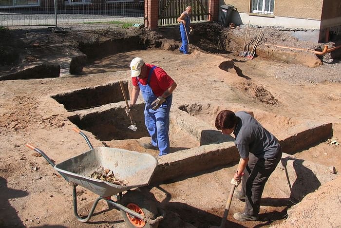 Bis Ende August sollen diese abgeschlossen sein, sagte Grabungsleiter Peter Sokalla. Bisher haben wir hier mehrere sogenannte Grubenhäuser aus dem 11. bis 13. Jahrhundert entdeckt, sagte er. Diese eingetieften Häuser, die ohne Mauerwerk aus Holz gebaut wurden, könnten eventuell auch älter sein. Das sei noch nicht abschließend geprüft. In diesem Bereich habe man auch Keramikscherben und Tierknochen gefunden, die man dieser Zeit zuordnen könne. Im hinteren Bereich der Ausgrabungsstelle in Richtung Pferdemarkt sei man auf eine Abfallgrube gestoßen, in der sich noch eine Münze von 1760 befand, so Sokalla.
