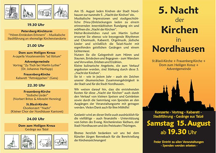 Am 15. August laden Kirchen der Stadt Nordhausen zur nunmehr 5. Nacht der Kirchen" ein. Musikalische Impressionen und stadtgeschichtliche (Neu-)Entdeckungen laden zu einem erinnernden innerstädtischen Rundgang ein und eröffnen die Nacht der Kirchen.