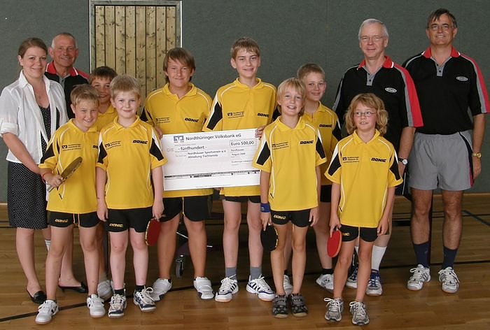 Dank der großzügigen Unterstützung durch die Nordthüringer Volksbank konnten die jungen TT-Spielerinnen und TT-Spieler eine komplette Ausstattung an Wettkampfkleidung in Empfang nehmen. Die Filialleiterin, Frau Rammelt, wünschte den jungen Sportlern viel Erfolg für ihre erste Wettkampfsaison.