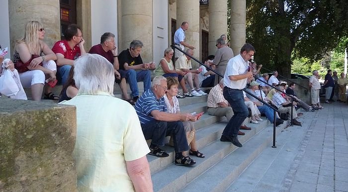 Zwischen den Rednern gab es Musik von den Golden Sixtees und eine Hüpfburg für Junggebliebenen, für alle Rostbratwurst. Drei oder vier zusätzliche Zuschauer gesellten dazu, der Schatten des Theaters wurde naturgemäß länger, der Beobachter zählte rund 100 Interessenten.