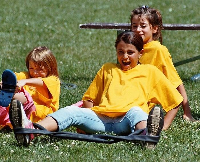 (Mit zwischen den Füßen gespanntem Fahrradschlauch werden Papprollen abgeschossen)