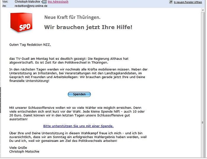 Herr Matschie: 1. nennt sich die nnz eben nnz und nicht NZZ. Das ist das Kürzel der Neuen Züricher Zeitung. Vielleicht hat deren Redaktion ja auch eine Bettelmail erhalten. Und 2. Ich empfinde den Vorgang an sich als absolute Frechheit.