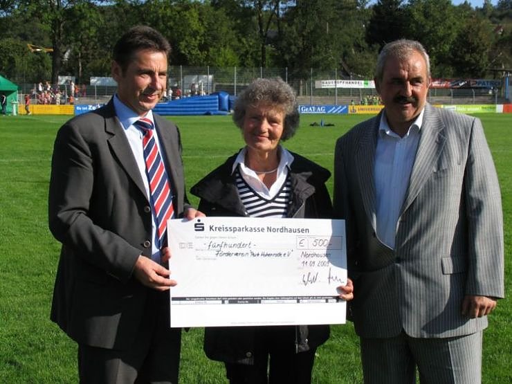 Nach einem Benefizlauf der Schüler für den Park Hohenrode übergab Wolfgang Asche vom Vorstand der Kreissparkasse und Schulsportkoordinator Werner Hütcher einen Scheck in Höhe von 500 Euro an die Vorsitzende des Fördervereins Park Hohenrode, Gisela Hartmann.