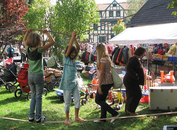 Pastorin Elke Conrad und ihr Team freuen sich auf regen Zuspruch - unter Aufsicht eines Elternteiles können die Kinder im Pfarrgarten gern spielen: Rutschen, Schaukeln, Klettern, Tanz auf dem Seil, Boccia, Ringewerfen, Tischtennis und als Highlight: Rollenlaufen - da kommt keine Langeweile auf.