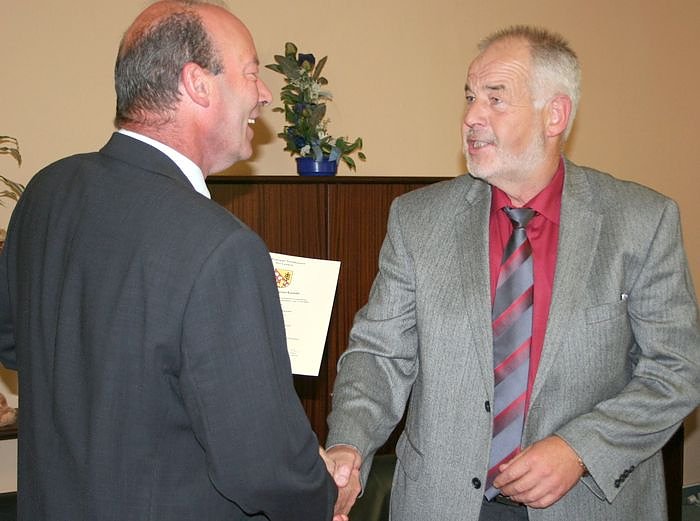 Bernd Gaßmann ist auch in den kommenden sechs Jahren der Vorsitzende der Verwaltungsgemeinschaft (VG) Hainleite. Landrat Joachim Claus übergab ihm heute Im Landratsamt die Ernennungsurkunde und gratulierte herzlich.