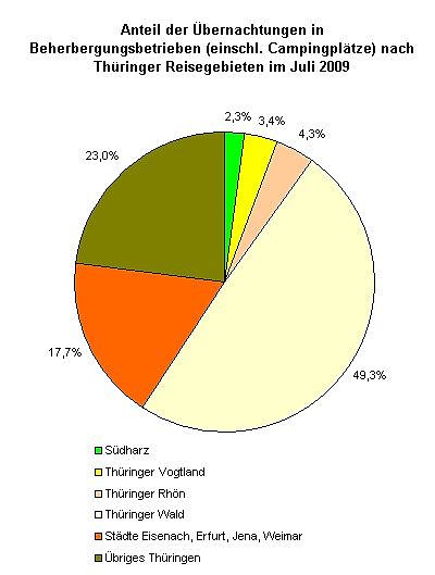 Im Juli 2009 meldeten die Thüringer Beherbergungsstätten (mit neun und mehr Betten) und die Campingplätze (ohne Dauercamping) insgesamt 326.000 Gästeankünfte. Das waren nach Mitteilung des Thüringer Landesamtes für Statistik 2,0 Prozent mehr Ankünfte als im Juli 2008. Die Zahl der Übernachtungen stieg um 5,4 Prozent auf 1 Million. Die Verweildauer pro Gast war mit durchschnittlich 3,1 Tagen etwas länger als im vergleichbaren Vorjahresmonat (3,0 Tage).