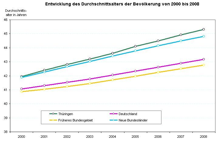 Niedrige Geburtenzahlen, steigende Lebenserwartung und Abwanderungen in unterschiedlichem Maße führten nach Mitteilung des Thüringer Landesamtes für Statistik auch in den letzten 8 Jahren zum stetigen Anstieg des Durchschnittsalters der Thüringer Bevölkerung. So war der Durchschnittsthüringer mit 45,3 Jahren am 31.12.2008 um 3,4 Jahre älter als am Jahresende 2000 (41,9 Jahre).