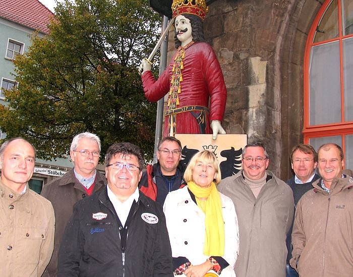 Mitglieder des Vorstands des Thüringer Gemeinde- und Städtebunds vor dem Nordhäuser Roland