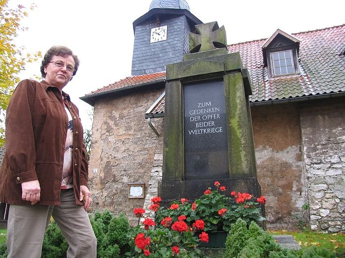 Ingrid Weifenbach pflegt seit Jahren das Denkmal vor der Petersdorfer Kirche