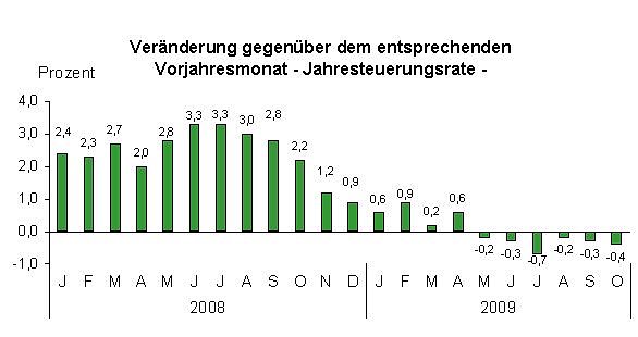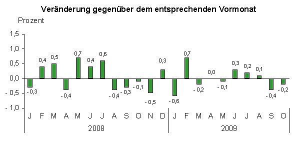 Im Vergleich zum Oktober 2008 gab es den höchsten Anstieg bei den alkoholischen Getränken und Tabakwaren (3,0 Prozent). Für Nahrungsmittel und alkoholfreie Getränke sanken die Preise um 2,9 Prozent.